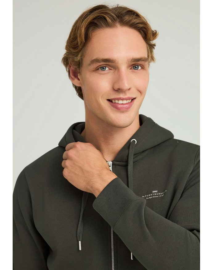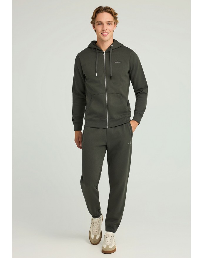 Ανδρική ζακέτα φούτερ σε κανονική γραμμή, σε single-color αποχρώσεις, ιδανική για τη φθινοπωρινή και χειμερινή περίοδο. Διαθέτει κουκούλα με κορδόνι, μακριά μανίκια και ίσιο στρίφωμα, ενώ το φερμουάρ και η μπροστινή τσέπη εξασφαλίζουν πρακτικότητα. Το τυπωμένο λογότυπο και το μεταλλικό έμβλημα προσθέτουν μια διακριτική premium πινελιά. Κατασκευασμένη από φυσικές ίνες σε βαμβακερό μείγμα, η ζακέτα συνδυάζεται εύκολα με τζιν και sneakers για ένα χαλαρό αλλά στιλάτο outfit – ιδανικό για καθημερινές εμφανίσεις ή αστικές εξορμήσεις.
